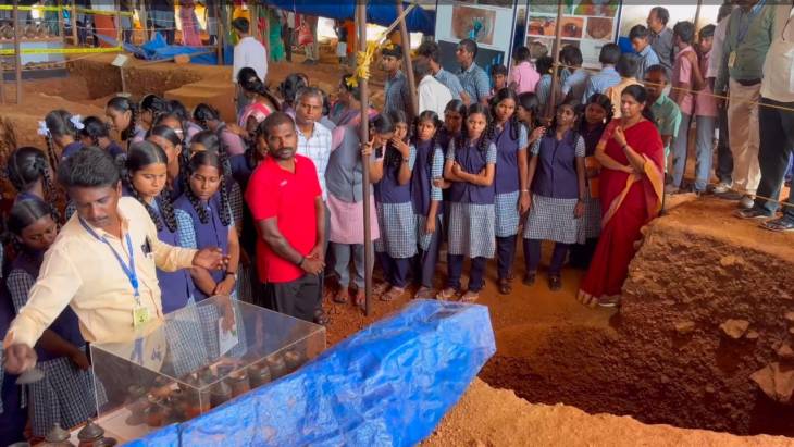 ஆதிச்சநல்லூருக்கு வருகை தந்த மாணவிகளுக்கு மத்திய தொல்லியல் துறை அலுவலர் முத்துக்குமார் கனிமொழி எம்.பி. முன்னிலையில் மாணவ மாணவிகளுக்கு ஆதிச்சநல்லூர் அகழாய்வு பணிகள் குறித்தும், அகழாய்வு பணியில் கண்டுபிடிக்கப்பட்ட முதுமக்கள் தாழிகள், தொல்லியல் பொருட்கள் குறித்தும் விளக்கம் அளித்தனர்.